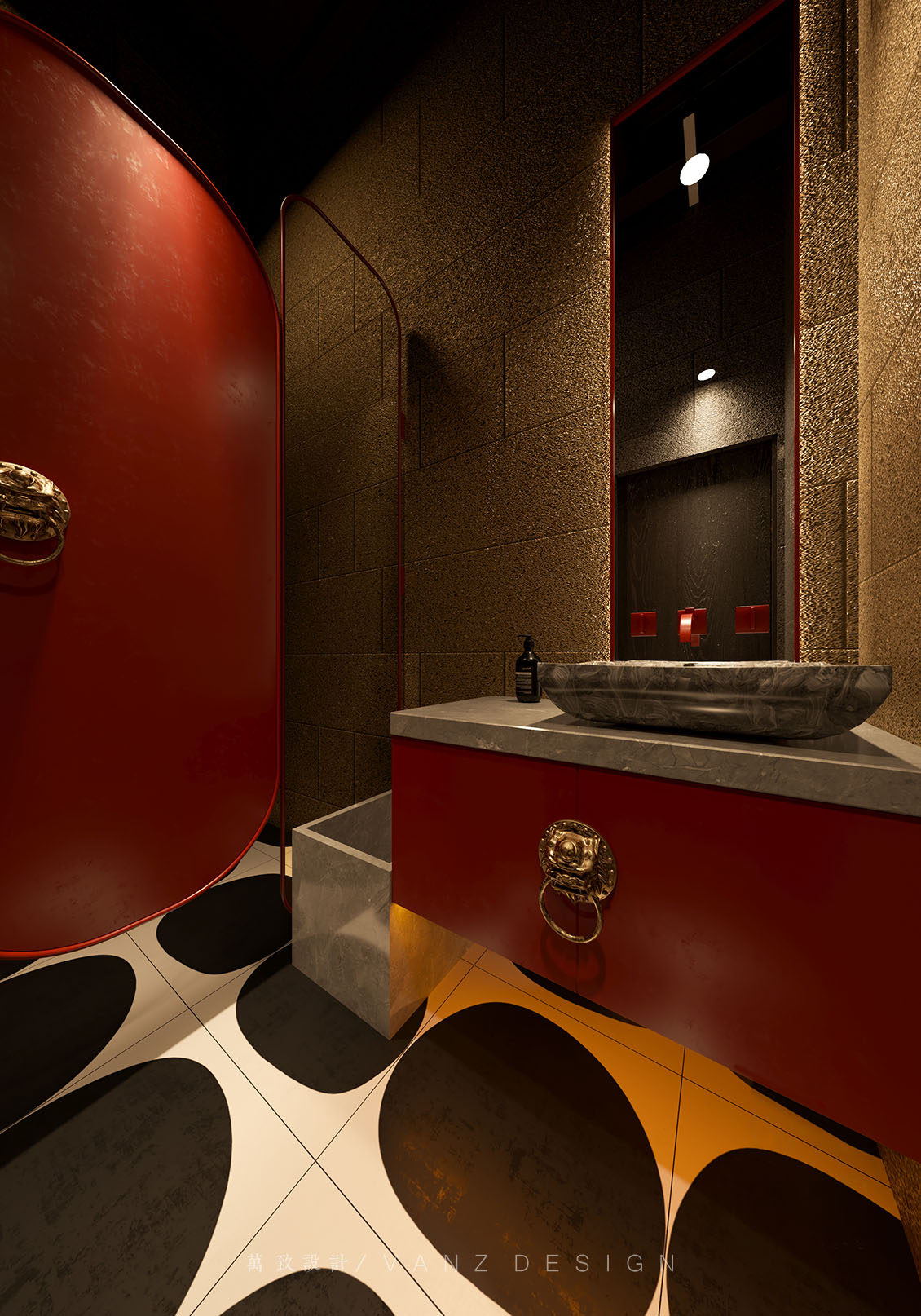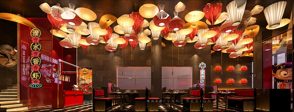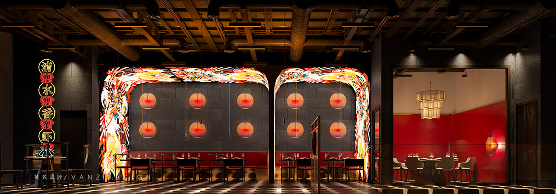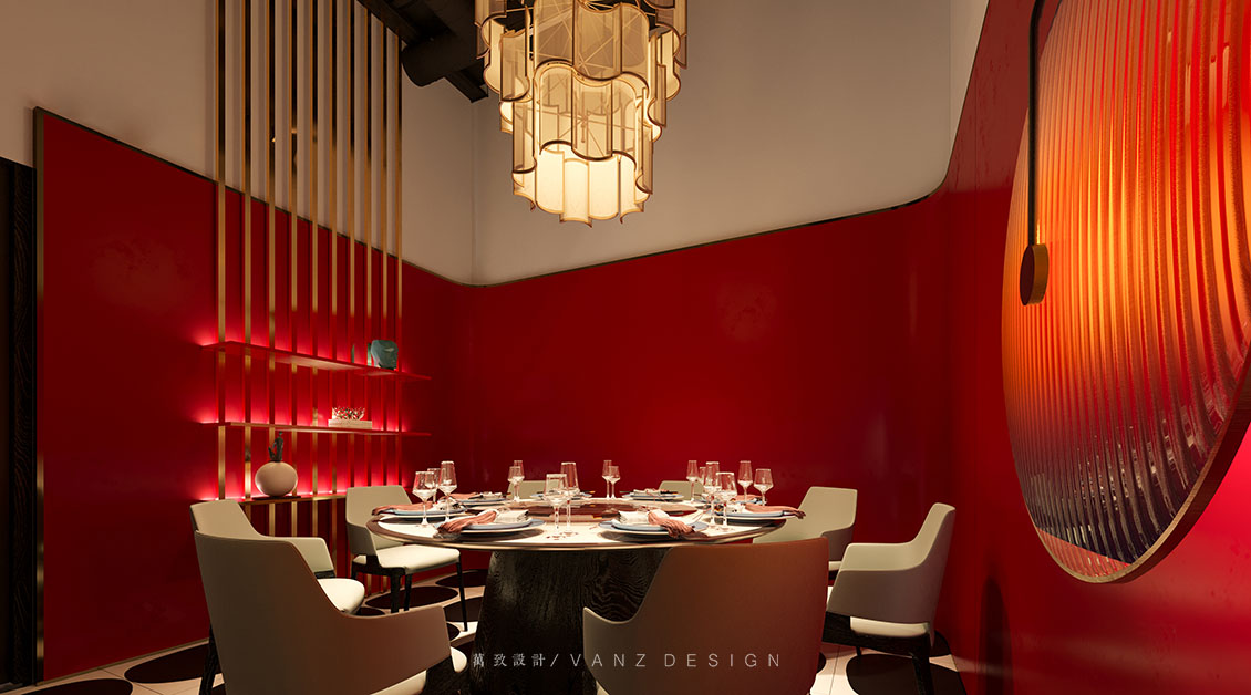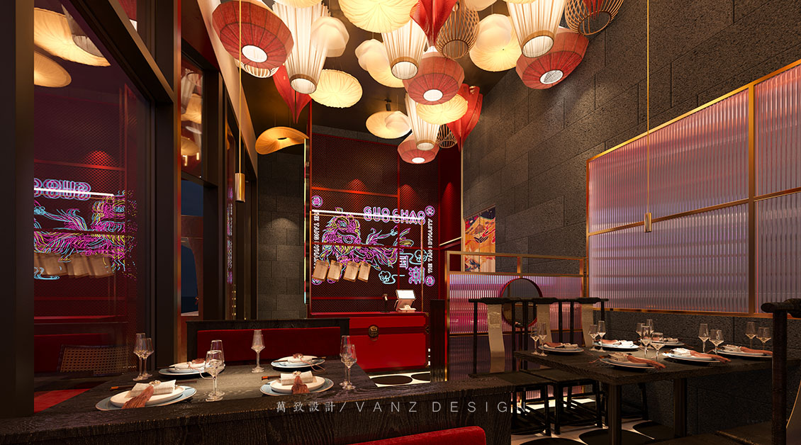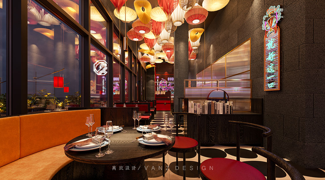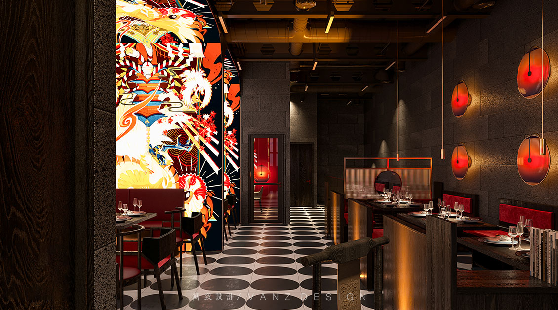 大面積的素灰色將空間向更深處沉淀下去,然后紅色的燈籠躍然于上,浮游穿梭于天花,整個空間流線被勾勒得清晰靈動。