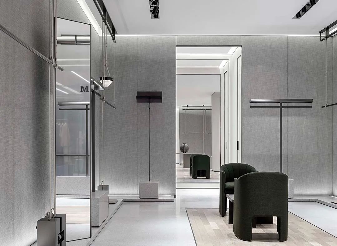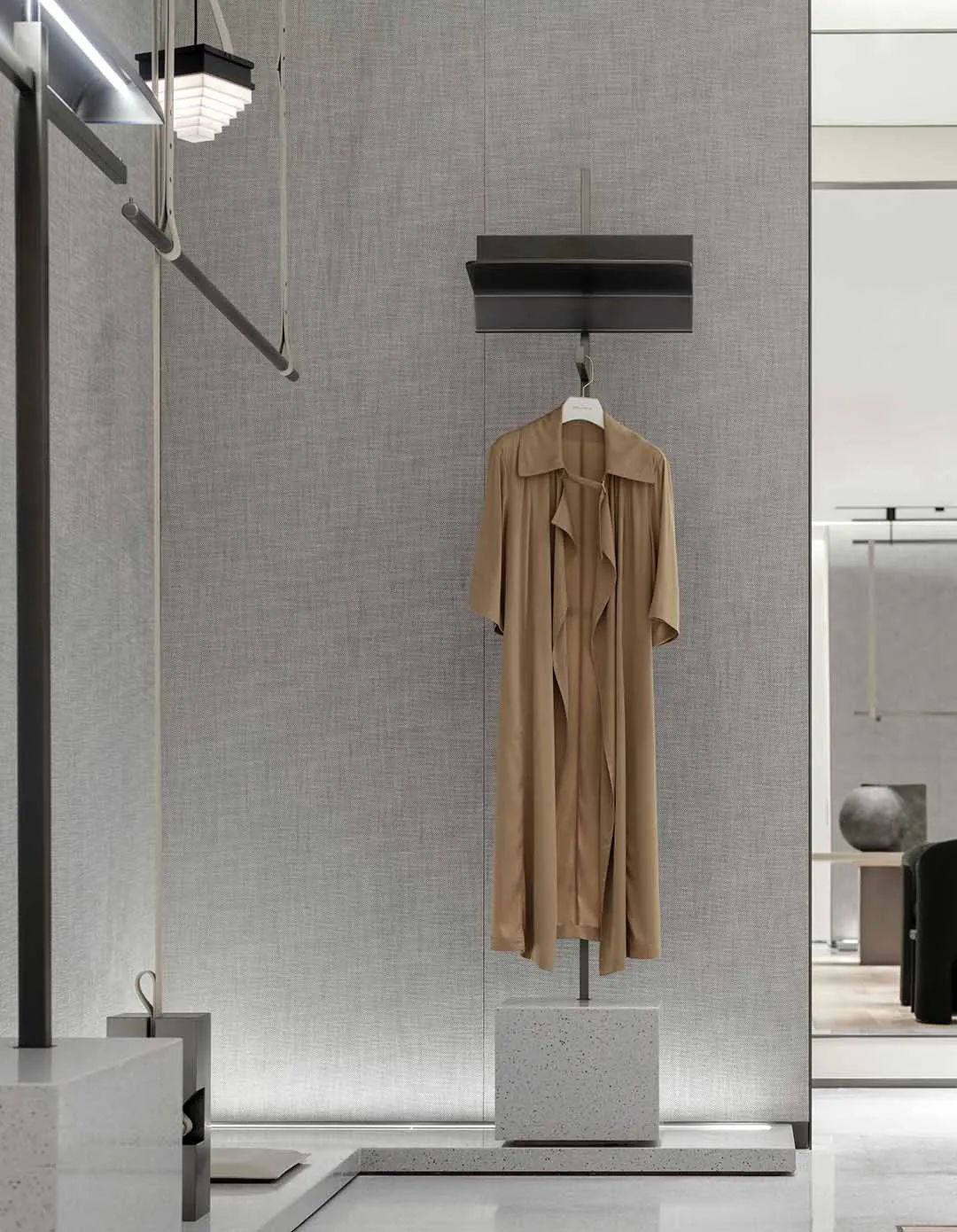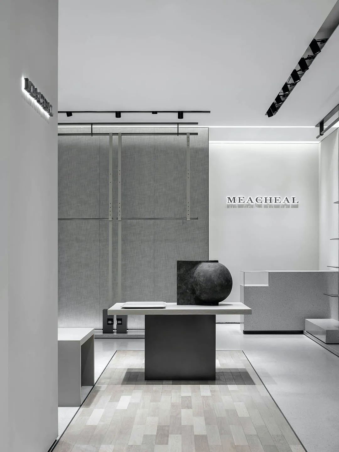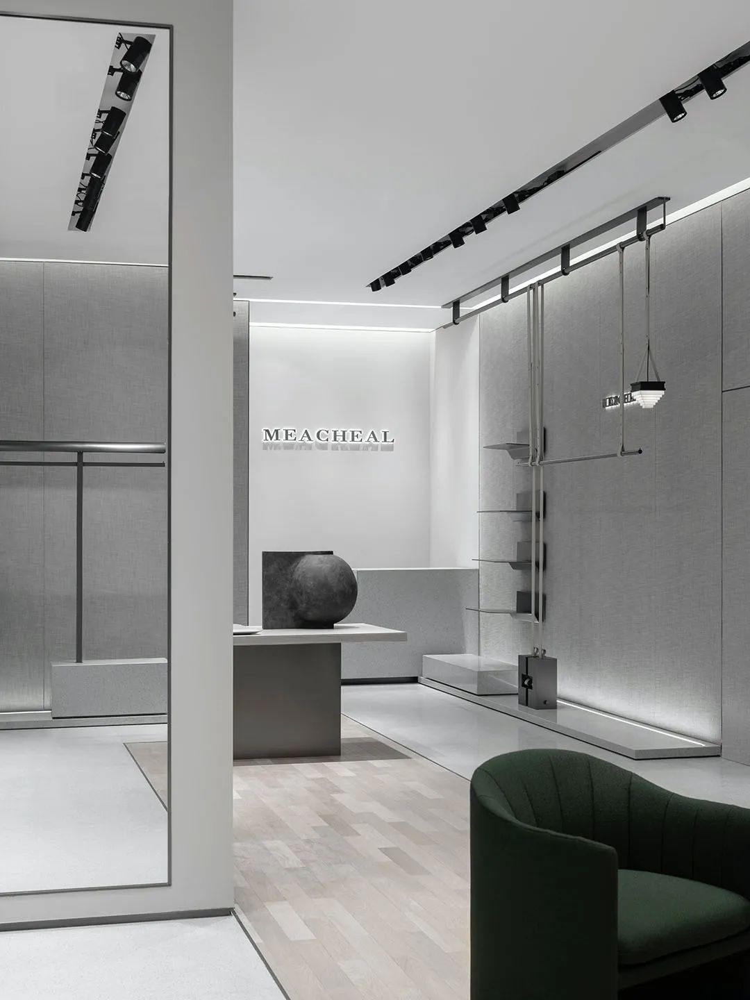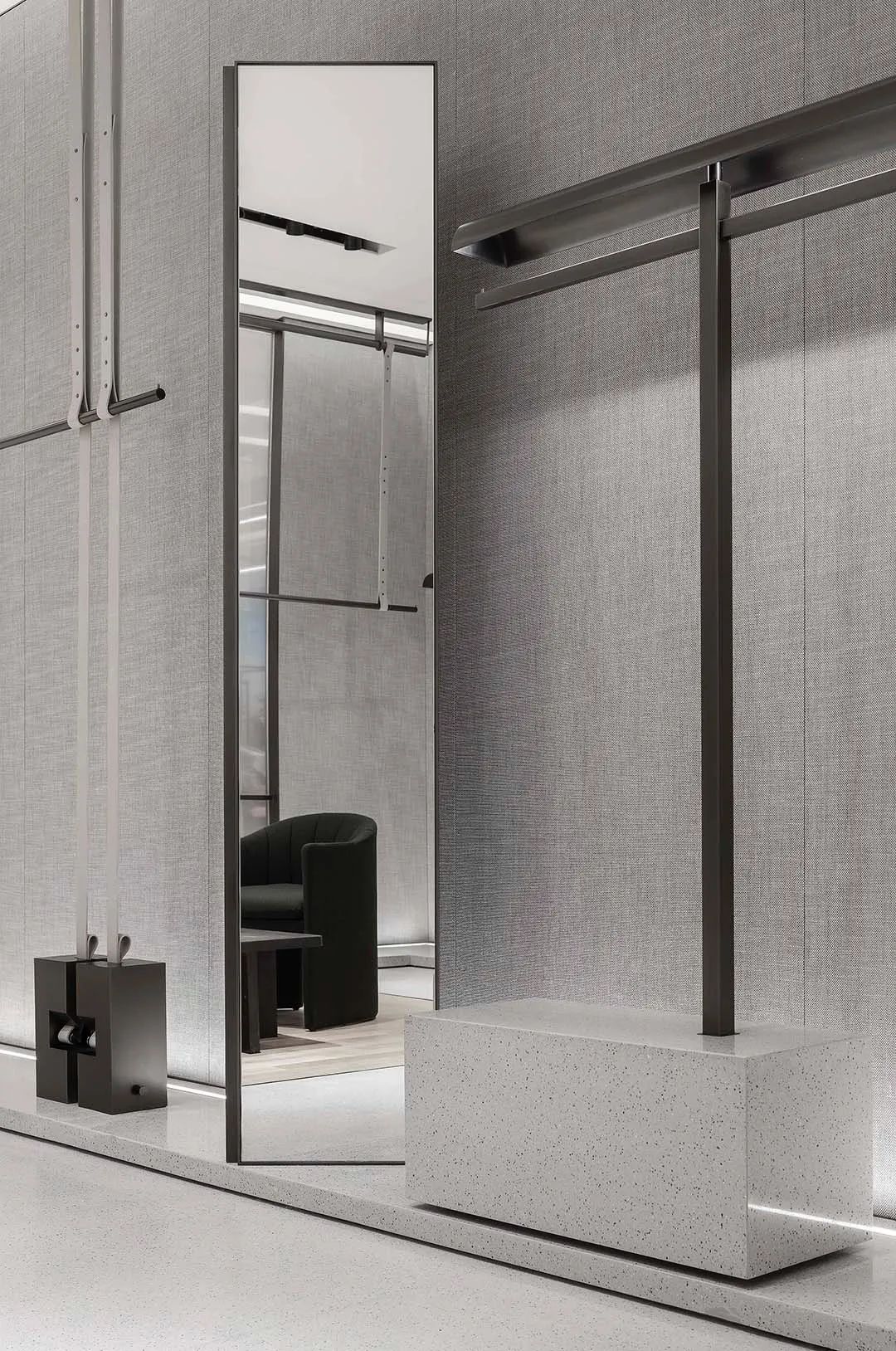 整體空間的中性灰色,是色調(diào)也是調(diào)性,更是感受和態(tài)度,但絕不僅僅是顏色。陳列區(qū)不僅排布整齊,更方便顧客對所需物品的選購,而足夠?qū)挸ǖ耐ǖ揽臻g不僅避免了與自身衣物的摩擦,也方便顧客與同伴一起商議、挑選。