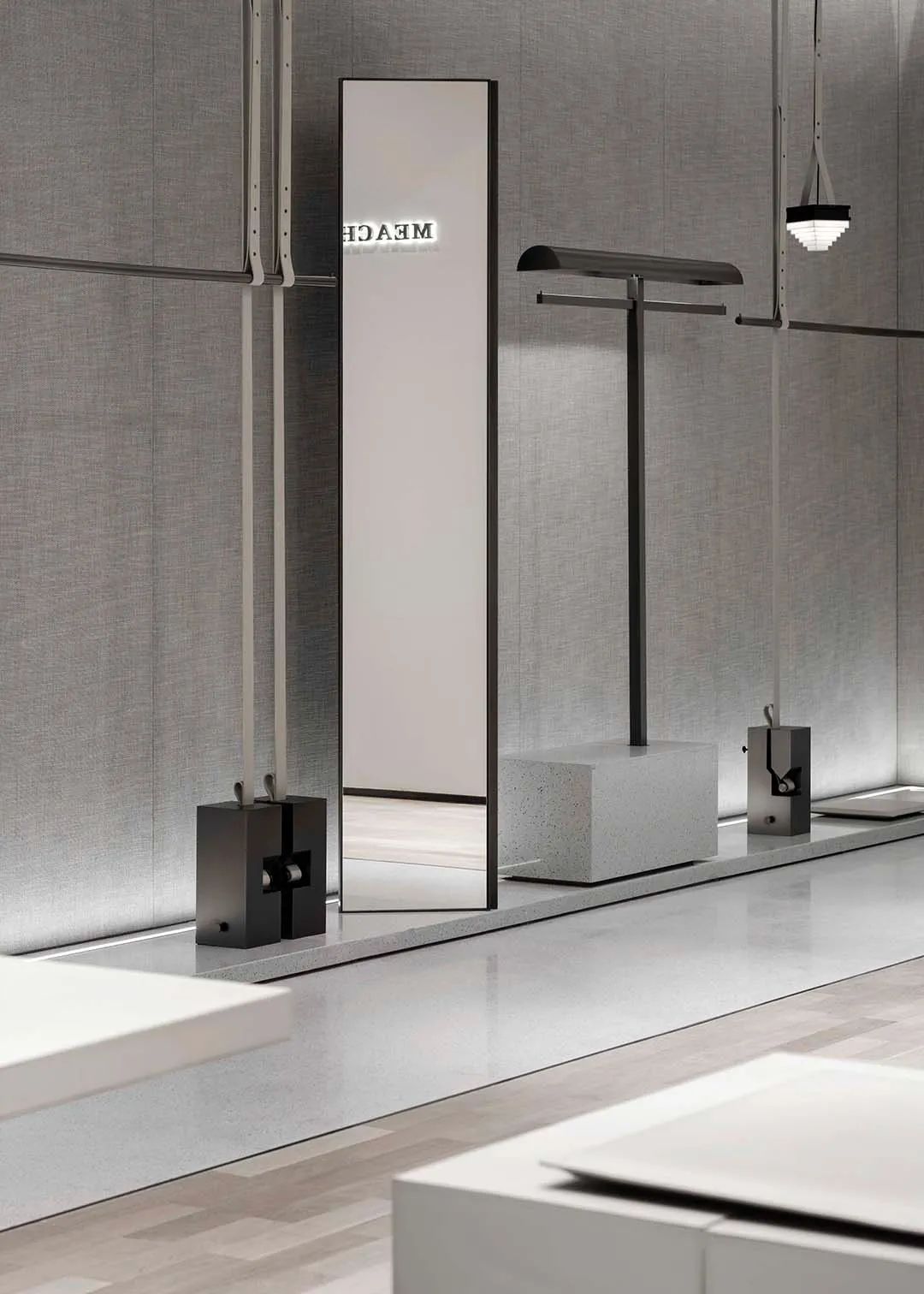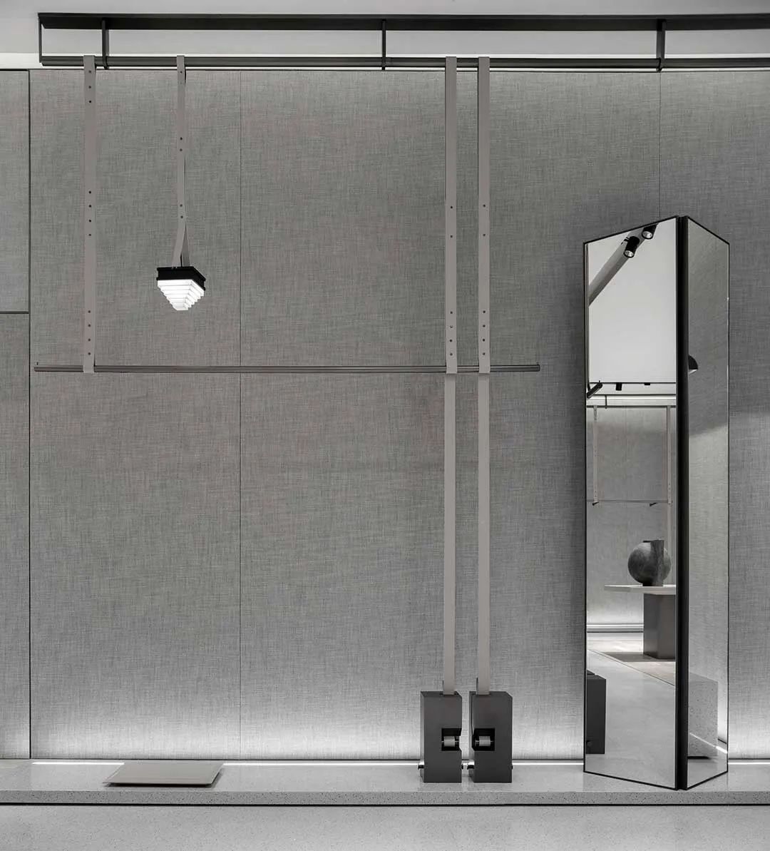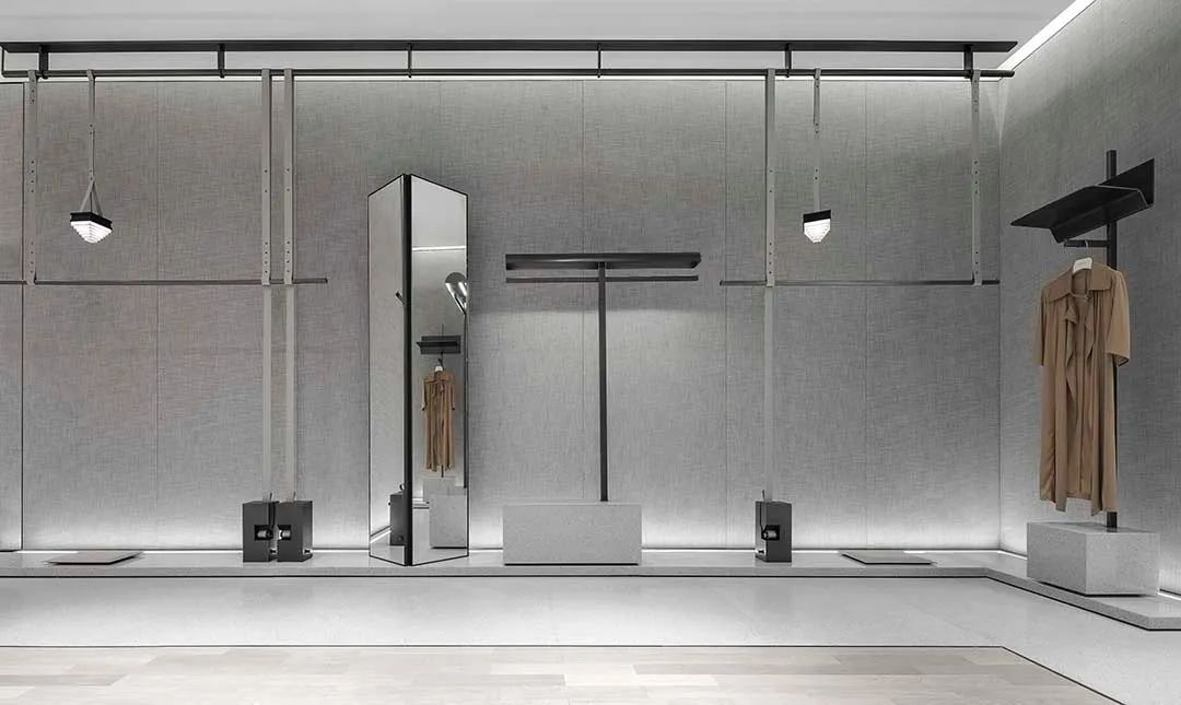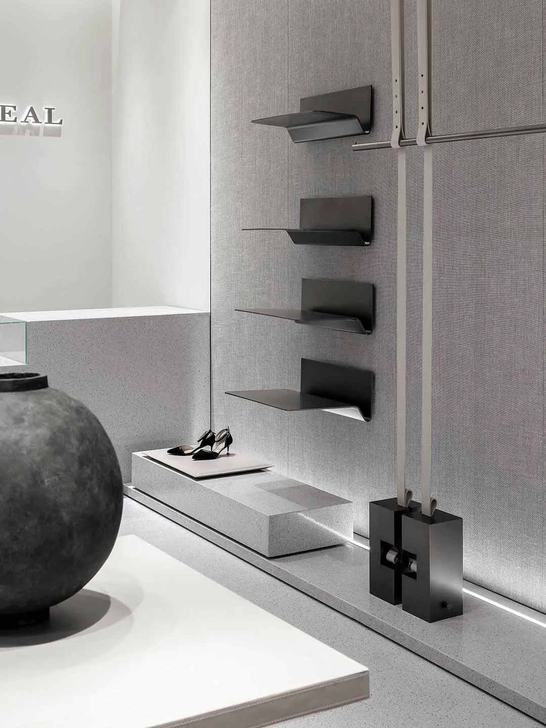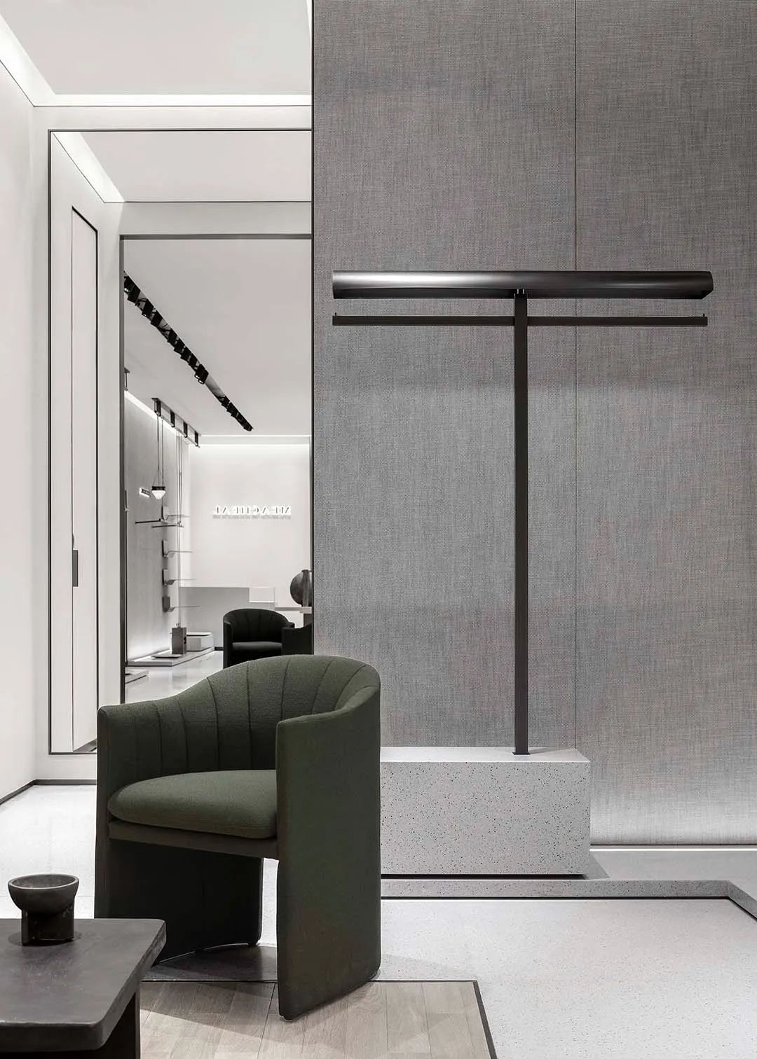 整體空間的中性灰色,是色調(diào)也是調(diào)性,更是感受和態(tài)度,但絕不僅僅是顏色。陳列區(qū)不僅排布整齊,更方便顧客對所需物品的選購,而足夠?qū)挸ǖ耐ǖ揽臻g不僅避免了與自身衣物的摩擦,也方便顧客與同伴一起商議、挑選。