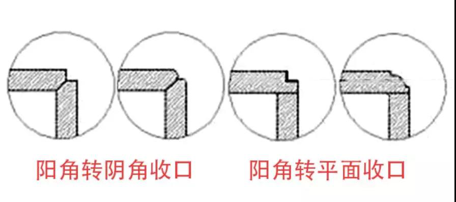 常規(guī)的木飾面(除特殊情況下)板厚度均為>12mm的厚板,施工現(xiàn)場中木飾面收口問題是木飾面最大的弊端之一,所有收口盡量都在陰角,哪怕在平面上最好收口放在陰角,如遇特殊特殊情況不得不在陽角收口時也要想辦法把陽角轉(zhuǎn)化成平面和陰角收口,否則會影響美觀。